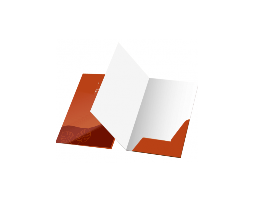 Pasta com bolsa encaixe papel 250g impressão colorida + verniz total frente, formato aberto 31x44cm e 22x31cm Fechado.