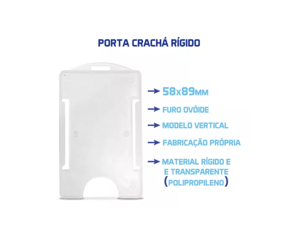 Modelo: Porta Protetor Crachá Rígido Vertical Transparente Orientação: Vertical Material: Plástico Comprimento x Largura: 89 mm x 58 mm Rigidez: Rígido OBS: compre o cordão separadamente